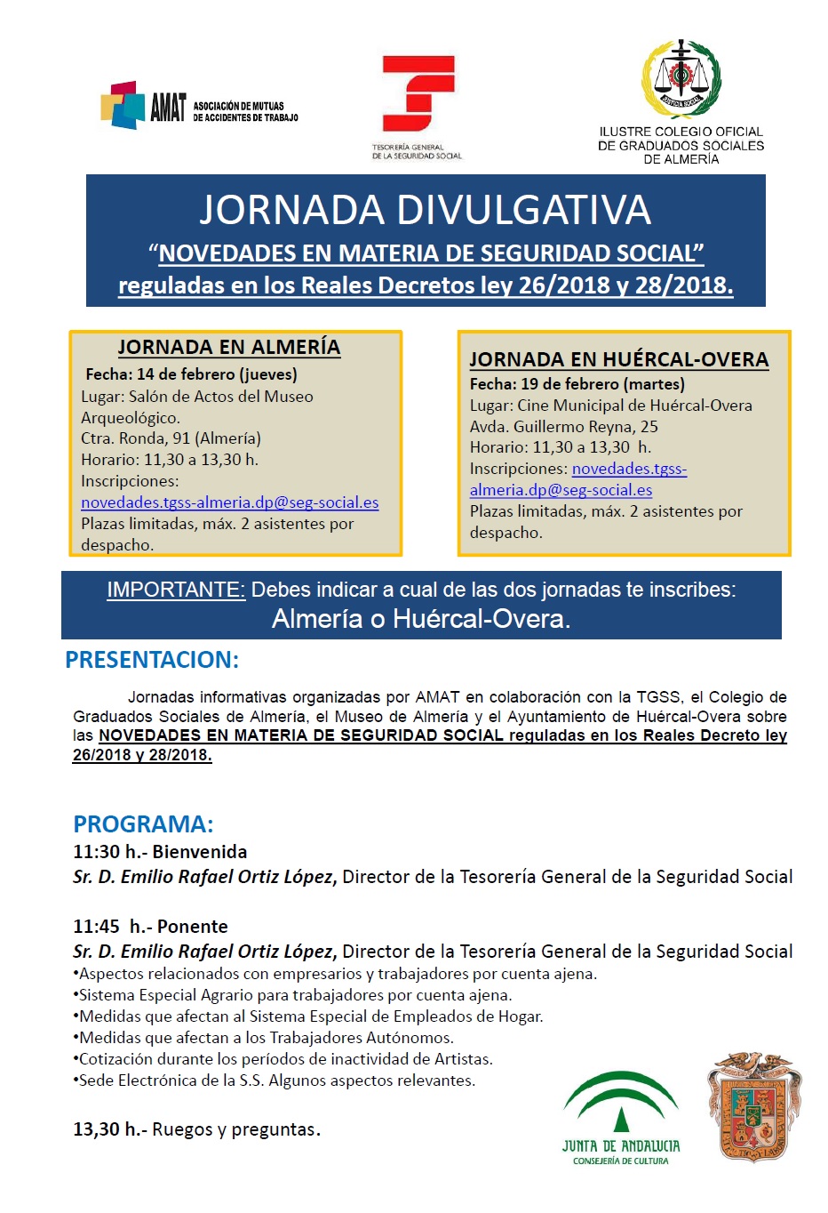 La primera jornada, se impartirá en Almería, el 14 de Febrero (jueves) en el salón de actos del Museo de Almería de 11,30 a 13,30 h. y la segunda el próximo día 19 de Febrero (martes) de 11,30 a 13,30 h. en el salón de actos del Cine Municipal de Huércal-Overa.